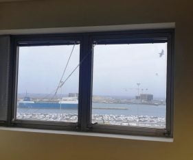 בניין ברמה מאוד גבוהה, עם חלונות לאורך הקיר ושתי מרפסות בכל קומה.